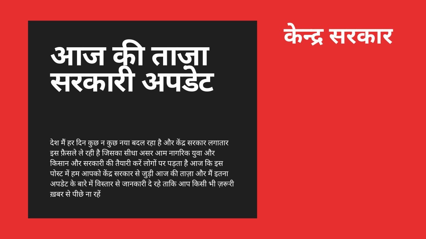 देश में हर दिन कुछ न कुछ नया बदल रहा है और केंद्र सरकार लगातार ऐसे फैसले ले रही है, जिनका सीधा असर आम नागरिकों, युवाओं, किसानों और नौकरी की तैयारी कर रहे लोगों पर पड़ता है। आज की इस पोस्ट में हम आपको केंद्र सरकार से जुड़ी आज की ताज़ा और महत्वपूर्ण अपडेट्स के…